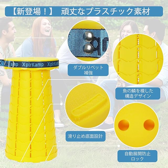 【安全ロック機構!突然の折りたたみを防止】独自の「防自開ロック」を搭載!展開時に「カチッ」と固定されるので、従来の携帯椅子のように座っている途中で折れる心配がありません。子供が乗せても、ガッチリ固定で安全をします。