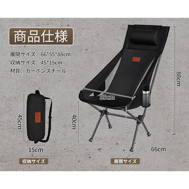 商品名:DesertFox アウトドアチェア 折りたたみ 枕付き 超軽量 【独自開発のカップホルダー】 【耐荷重150kg】 キャンプ椅子 コンパクト イス ハイバック 椅子 収納袋付属 お釣り 登山 携帯便利 0088 (ブラック,Large)