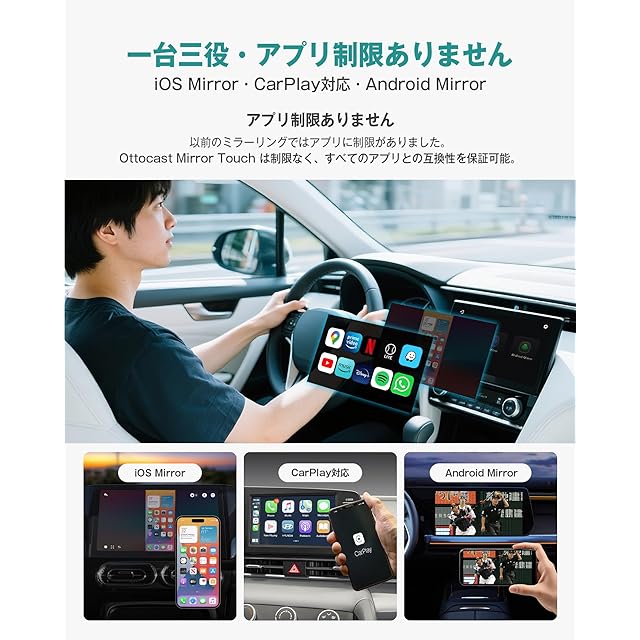 Ottocast Mirror Touch 車載ナビゲーションがスマホに瞬時に変身! 双方向制御 ミラーリング、スマホの逆方向制御を実現します! Ottocastが衝撃的な技術革新を遂げ、市場で唯一車載端末からスマートフォンを逆方向操作できる製品を誕生させました! ・双方向制御 ミラーリング ・急速充電 ・ワイヤレスCarPlay