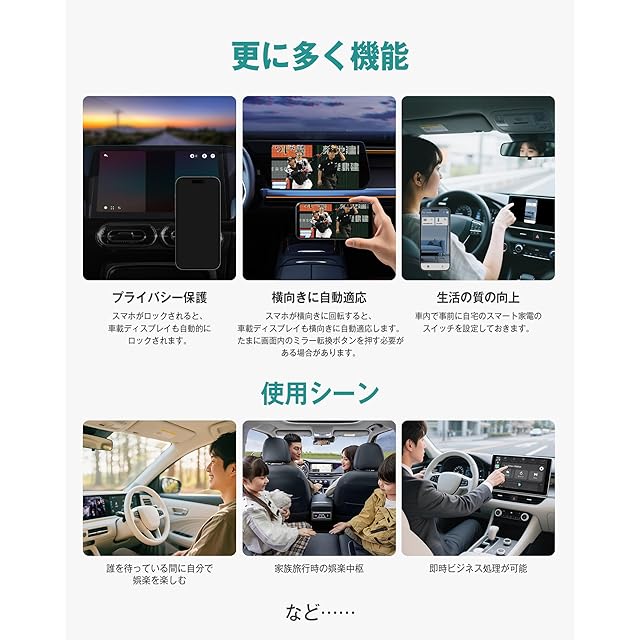 【CarPlay対応・一台三役】製品を起動する際、iOSミラー、CarPlay、Androidミラーの3種類のモードから自由に選択できます。また、デュアルモードが自動的にCarPlayとiOSミラーリングまたは Androidミラーリングの間で切り替わります。初回のセットアップ後、車を始動するとワイャレスCarPlayが自動的に起動します。※ご注意:ワイヤレスAndroid Autoが対応できません。Androidミラーリングができます。