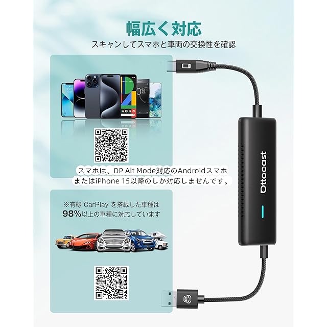 【安心の品質とサポート】日本で多くのCarPlay製品の実績を持つOttocast社によって製造された製品であり、技適(R201-220660)を取得しています。我々の使命は、お客様により質の高い運転生活を送っていただくことです。「お客様第一主義」という理念を掲げておりますので、製品に何らかの問題がございましたら、お気軽にお問い合わせください。状況に応じて返金、交換などのアフターサービスを提供いたします。