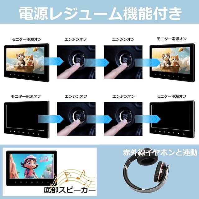 【取付簡単】多サイズのシャフトアダプター同梱、従来のヘッドレストモニターからアップデートされ、専門工具も必要なくあらゆるサイズのヘッドレストに簡単に取付け可能です。シャフトに装着するタイプなので、スッキリコンパクトです。不要の時に取り外しも簡単。ヘッドレストモニター本体は角度調整できて、見やすい角度で楽しめます。電源レジューム機能付き、エンジンオフ前のヘッドレストモニター状態を記憶し、次回エンジンをかけると、前回の電源状態と一致できます。