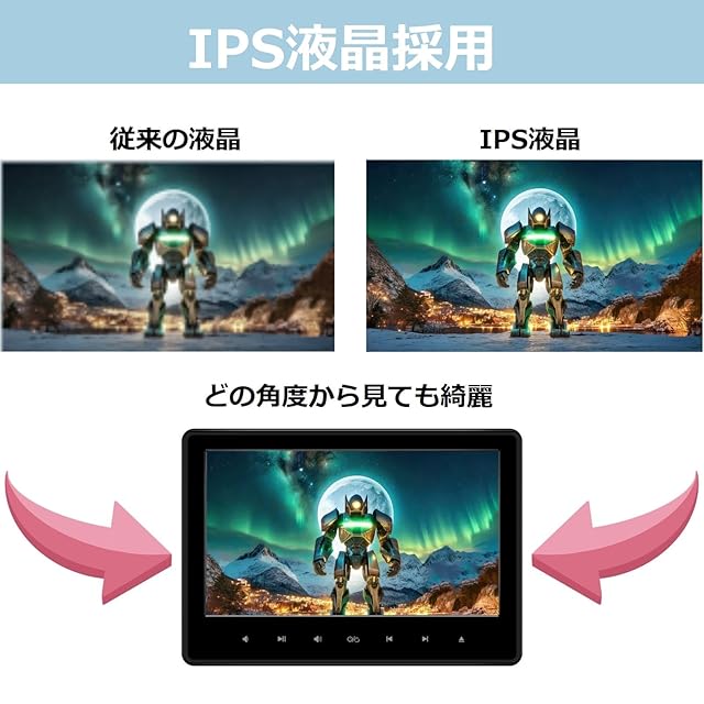 【全視角度IPS液晶】DVDプレーヤー内蔵ヘッドレストモニターに10.1インチの全視角度IPS液晶搭載、お子さんの目に優しい上に、環境にも優しい。長時間のドライブでも遠慮なく楽しい車内空間を演出。