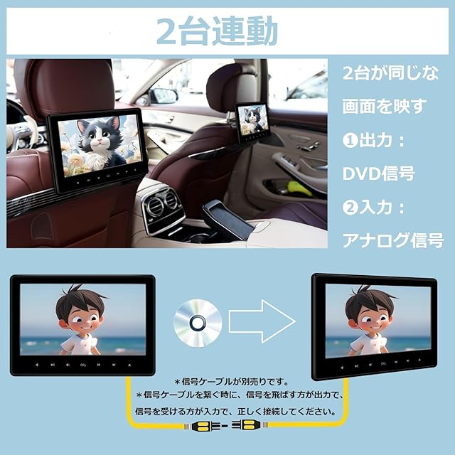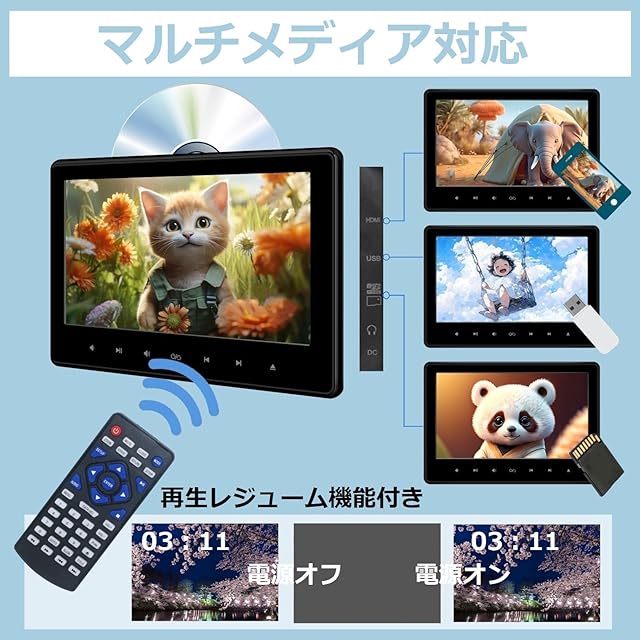 【機能多様】CPRMディスクに対応することで、録したものも再生できます。リージョンフリーで、日本のDVDだけではなく 、海外のDVDも見ることができます。更に、再生レジューム機能搭載、再生を途中で停止させた場合、次回再生時に同じ場所から再生が可能(再生レジュームはCPRMディスクに非対応)。DVDの信号がケーブルで出力可能なので、2台セットの場合、2台が同じな画面を映せます。HDMI機能でスマホと連動し、スマホ時代に負けません。メモリーに保存された映像・音楽など再生対応でき、USB/SDマルチメディア再生で車内でエンターテイメント。家庭用ACアダプターを手配すれば、お宅でも利用可能。様々な機能付き、実用性向上したヘッドレストモニターになります。
