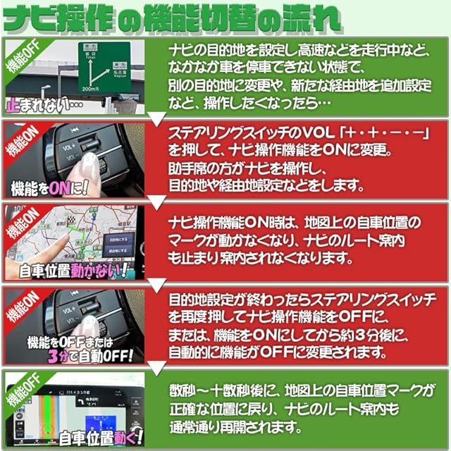 走行中でもナビ操作ができる! ナビに目的地設定をし向かう道中で、急に目的地の変更や、経由地の追加をしたくなっても、高速道路を走行中などは、なかなか車を停車してナビの設定をすることができません!! ところが製品を取り付けると、普段は純正状態と変わりませんが、ナビ操作をしたいときだけ機能をONに変更することで、走行中でもナビの操作が可能になります。