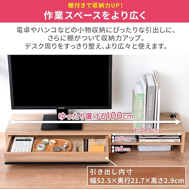 商品サイズ(cm)/本体:幅約100×奥行約26.4×高さ約13(ケーブルホルダーを含まず)、引き出し内寸:幅約52.5×奥行約21.7×高さ約2.9