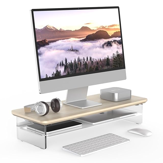 Fenge モニター台 モニタースタンド 卓上 机上台 パソコン台 PC台 机上ラック 60cm横幅 2段 木製天板 アクリル製脚 デスクトップ用 机上 モニタースタンド 机上台 pcモニター台 パソコンラック 卓上 収納 整理整頓 オークG04Y2063C