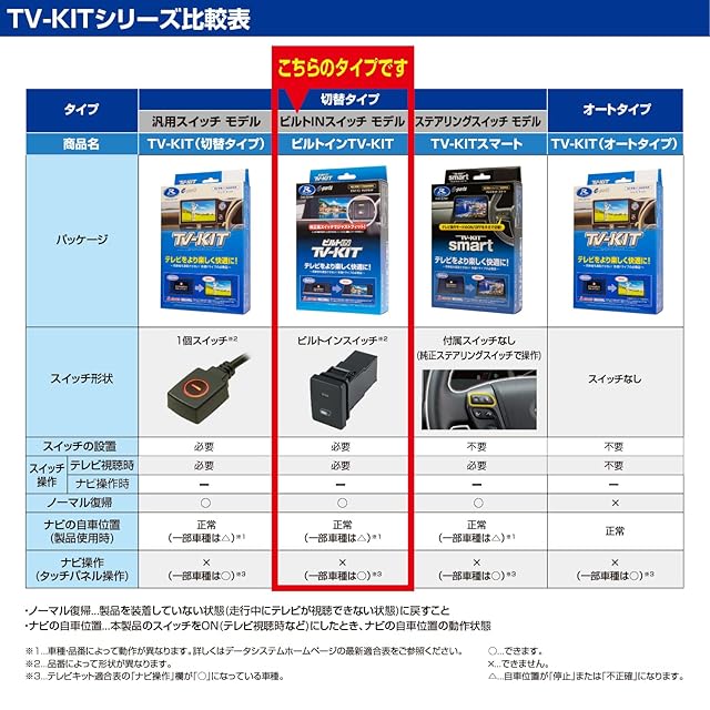 装着する車種またはナビの機種により、製品の適合品番が異なります。車両にスペアスイッチホールがない場合、既に使用されている場合にはビルトインタイプは取り付けできません。