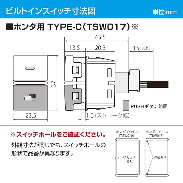 ビルトインスイッチ寸法(TSW017):W23.5mm×H37mm×D43.5mm
