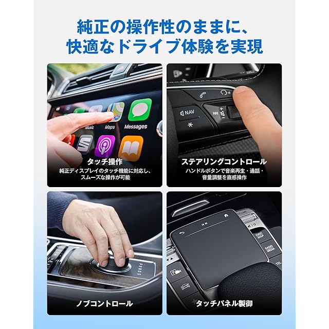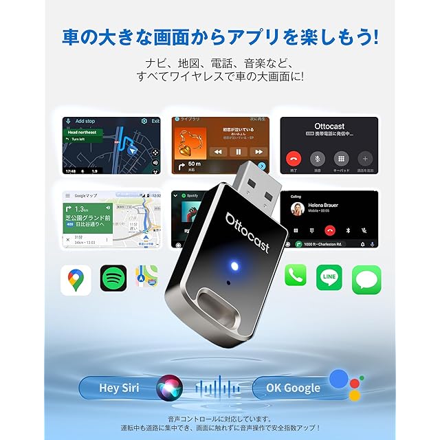 【便利機能満載・車両操作と完全に統合】ナビ、地図、電話、メッセージ、LINE、音楽など、すべてワイヤレスで車の大画面に!CarPlayまたはAndroid Autoがサポートするソフトウェアであれば、すべて使用することができます。音声コントロールもできます、「Hey、Siri」または「OK、Google」をサポートしています、音声操作で各種機能を使うことができます。ノブコントロール、タッチパネル製御、タッチスクリーンコントロールやステアリングコントロールなどのを同期して操作できます。Ottocast MINIにより、運転中のあらゆるニーズを完全にカバーできます。