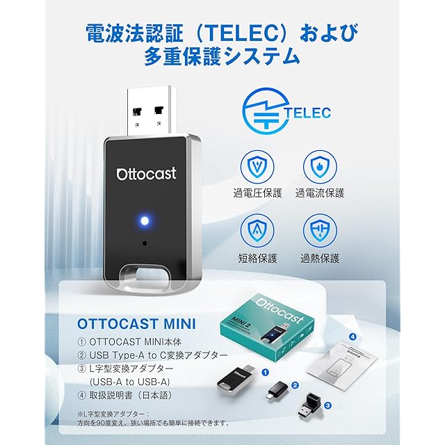 商品名:【公式】オットキャスト ミニ OTTOCAST MINI 2025最新 CarPlay&AndroidAuto ワイヤレス化 アダプター 自動接続 98%以上の車種適用 アンドロイドオート&カープレイ無線化接続 接続簡単 Bluetooth/音楽/音声コントロール/GPSナビゲーション 【技適取得済み品】