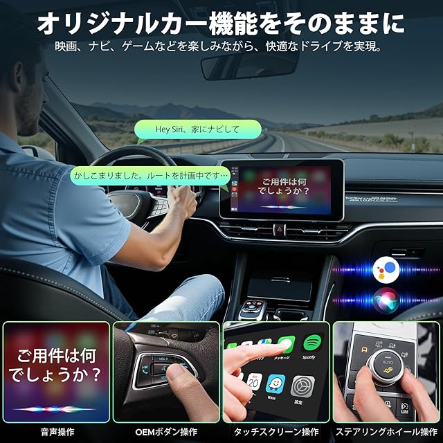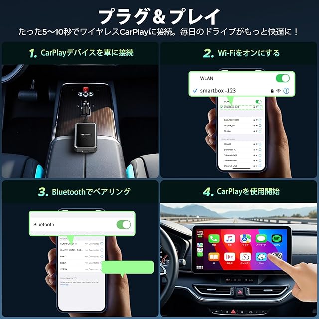 【純正有線CarPlay車のみ対応】iPhoneを無線で接続することができます。無線CarPlayにより、車内でスマートフォンの地図、音楽、通話などの機能を使用し、よりスマートなドライブ体験を提供します。高速道路で音声ナビゲーションを使って簡単にルートを検索したり、通勤中にデータケーブルを差し込むことなく好きな音楽を再生したりできます。2016年から2020年製の純正カーナビで、かつタッチスクリーンに対応している車種のみ対応しています。非兼容 :1.車両がもともとワイヤレスCarPlayに対応している場合;2.タッチスクリーン非対応のカーナビの場合;3.サードパーティ製の(純正ではない)カーナビを使用している場合;4.元々ワイヤレスCarPlayに対応しているカーナビ;