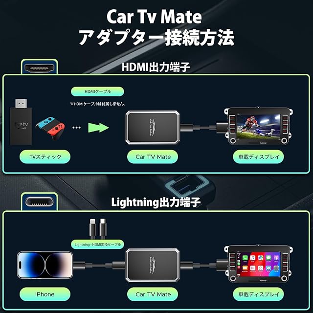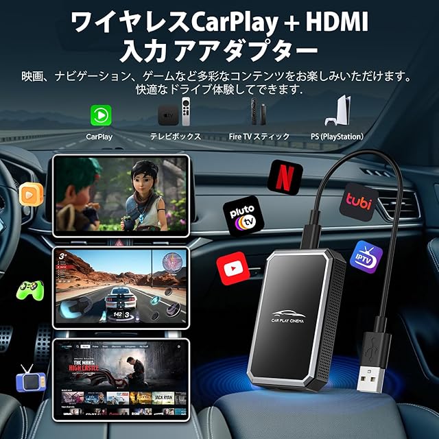 【HMID入力】Carplay TV Mate Maxは、他に類を見ない本格的な車載エンターテインメント体験を提供します。Fire TV Stick、Google TV、Nintendo SwitchなどのHDMI対応デバイスを接続するだけで、Netflix、YouTube、Prime Video、人気ゲームなどを車内で思う存分楽しめます。ドライブ中も、ご家族全員で退屈知らずのひとときをお過ごしいただけます。ご注意:本製品のリアモニター(後部座席用ディスプレイ)は、HDMI出力に対応しておりません。