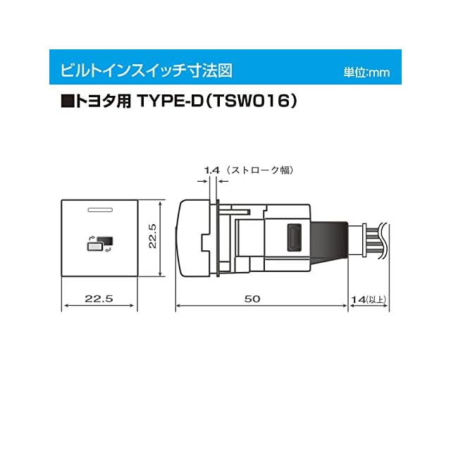 ビルトインスイッチ寸法(TSW016):W22.5mm×H22.5mm×D50mm