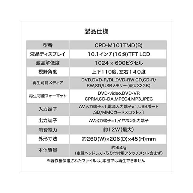 【商品仕様①】◇本体サイズ(1個あたり):幅26×奥行4.5×高さ20.6cm ◇本体重量(1個あたり):約950g ◇液晶ディスプレイ:10.1インチ(16:9)TFT LCD ◇解像度:1024×600ピクセル ◇視野角度:上下110度、左右140度 ◇再生可能メディア:DVD、DVD-R/DL、DVD-RW、CD、CD-R/RW、SD/USBメモリー(最大32GBまで) ◇再生可能フォーマット:DVD-Video、DVD-VR CPRM、CD-DA、MPEG4、MP3、JPEG※著作権保護管理されたファイルは本機では再生できません。