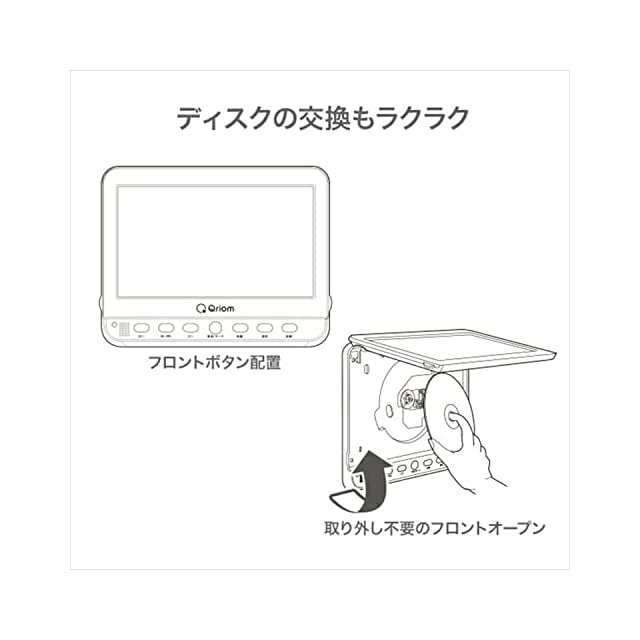 【簡単ディスク交換】取り出し不要のフロントオープン仕様なのでヘッドレストに装着したまま簡単にディスク交換ができます。。本体操作ボタンはフロントに見やすく配置されいるので、操作性にも優れています。