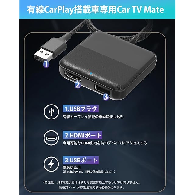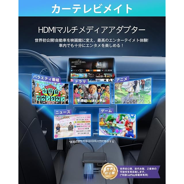 ★【ご使用上の注意】①本製品単体で動画やテレビを見ることはできません。TV stickなどのストリーミングメディアプレーヤーもしくは地デジチューナーをご用意ください。②このカーテレビメイトを使用する際には、外部のHDMIデバイスのリモコンまたは他の制御方法を使用する必要があります。③本アダプターとHDMI接続で動画配信サービスを視聴する際には、CarPlay機能が使えません。