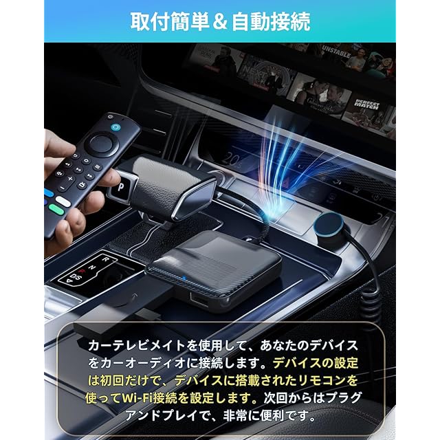★【取付簡単&自動接続】カーテレビメイトを車のCarPlay対応のUSBポートに差し込んだ後、HDMI出力のデバイスと繋がるだけで接続完了です。デバイスの設定は初回だけで、デバイスに搭載されたリモコンを使ってWi-Fi接続を設定します。次回からはプラグアンドプレイで、自動で接続されます。非常に便利です。