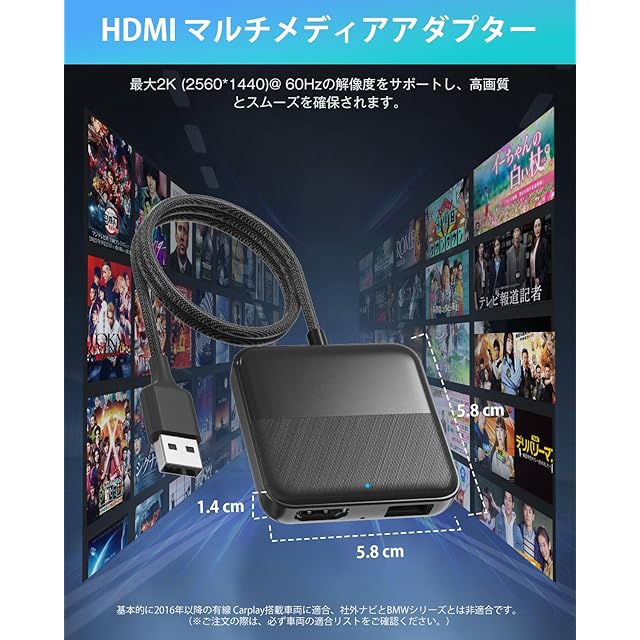 ★【高画質&スムーズ】HDMIポートを搭載され、最大2K (2560*1440)@ 60Hzの解像度をサポートし、高画質を確保し、ストリーミングがよりクリアかつスムーズになります。*ご注意:車種により解像度が違います。サイズは5.8*5.8*1.4cmで、わずか40gで、コンパクトな設計なので、携帯便利で、いつでもどこでも気軽に使えます。