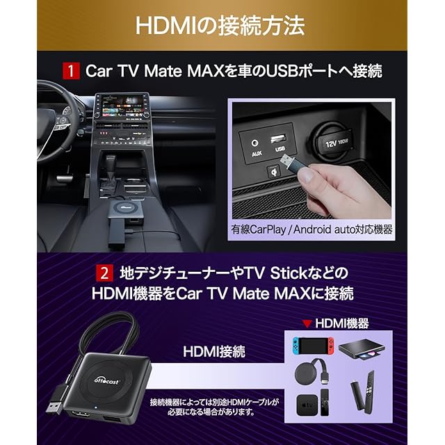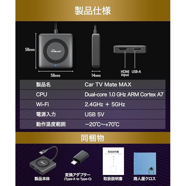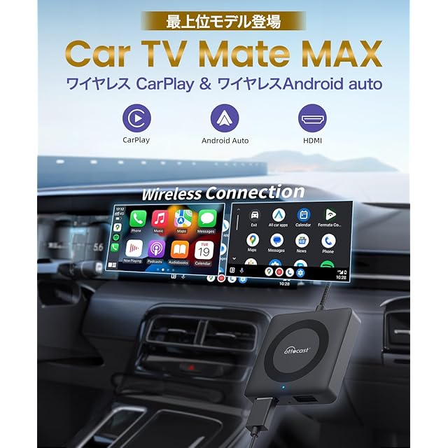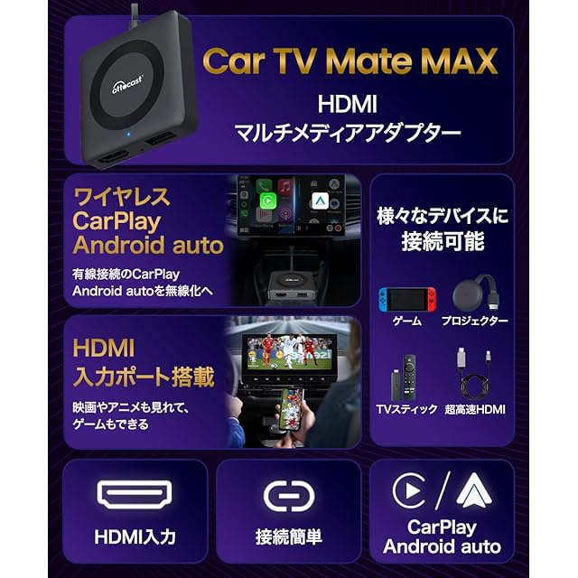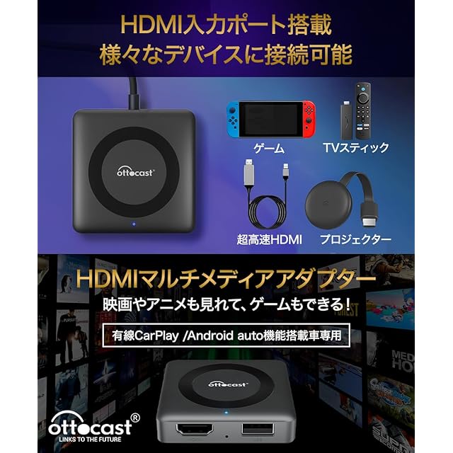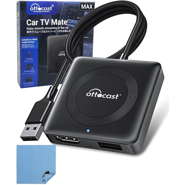 【国内正規代理店】オットキャスト カーテレビメイト マックス Ottocast car tv mate Max ワイヤレスCarPlay 有線CarPlay専用 HDMIマルチメディアアダプター/Fire TV Stick対応(条件あり)/スマホ画面ミラーリング・HDMI出力対応/(CA361-C4)