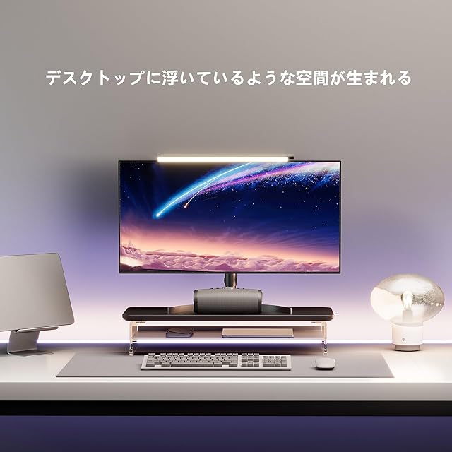 【アクリルの脚・浮いている空間】モニタースタンドの脚は、透明なアクリル板を採用しており、解放感があります。さらに、デスクトップに浮いているような感覚を与えます。特に夜にはLEDライトと組み合わせると、爽やかな昼間とは一変、神秘的な雰囲気を作り出します。