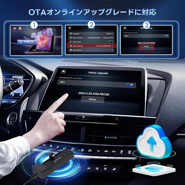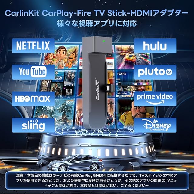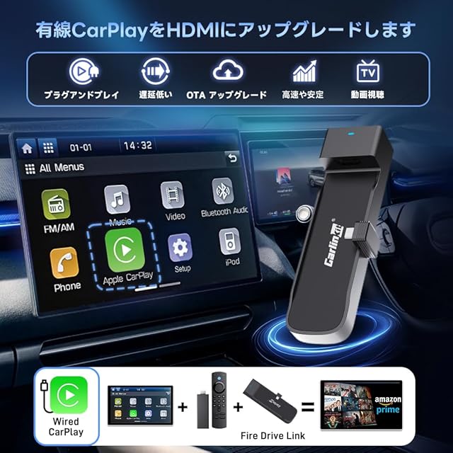 【CarlinKit CarPlay-Fire TV Stick-HDMIアダプター】:CarlinKit CarPlay-Fire TV Stick-HDMIアダプターは純正な有線CarPlayが内蔵される車種(非サードパーティのアンドロイドカーナビ)に対応可能です。原車CarPlayがHDMlアダプターをアップグレードし、HDMI信号源を原車に入力することをサポートし、有線CarPlayを通じて、車にHDMI入力が無くても簡単にFire TV スティックが使え、Youtube、Netflix などの動画視聴アプリをサポートし、ニュースやドラマ、バラエティー番組、アニメなど色々なビデオを車画面に再生できます。ビデオ解像度は原车従来のプロトコル解像度を維持し、HD再生をサポートし、OTAオンラインアップグレードもサポートします!