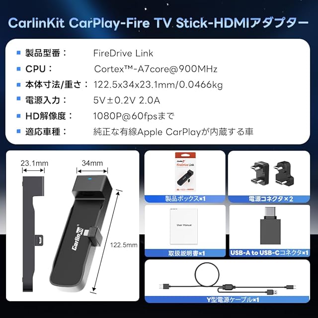 【必ずご注意】:①本製品は、原車に有線CarPlayを搭載している車種のみに対応しています。ご購入する前に必ずご確認ください。有線CarPlayに対応している車種が不明な場合は、自動車メーカーに連絡してください。②本製品には変換機能のみがあり、単体で動画やテレビを観ることはできません。Fire TV Stickと一緒にご利用ください。※Fire TV Stickやリモコンなどは含まれておりませんので、自分でご用意ください。③本商品を使用して動画を視聴する場合、CarPlay機能は使用できません。④更新前にHDMIアダプターはWiFi&ネットワーク共有に接続する必要があります。パスワードは12345678またはパスワードがない。⑤パッケージ内容: 製品ボックス×1、本製品×1、Y型電源ケーブル×1、USB変換(A⇒C)コネクタ×1、USB電源コネクタ×2、取扱説明書×1 ⑥購入時に製品について何か不明な点があれば、お気軽にお問い合わせください。弊社は喜んでお手伝いいたします。