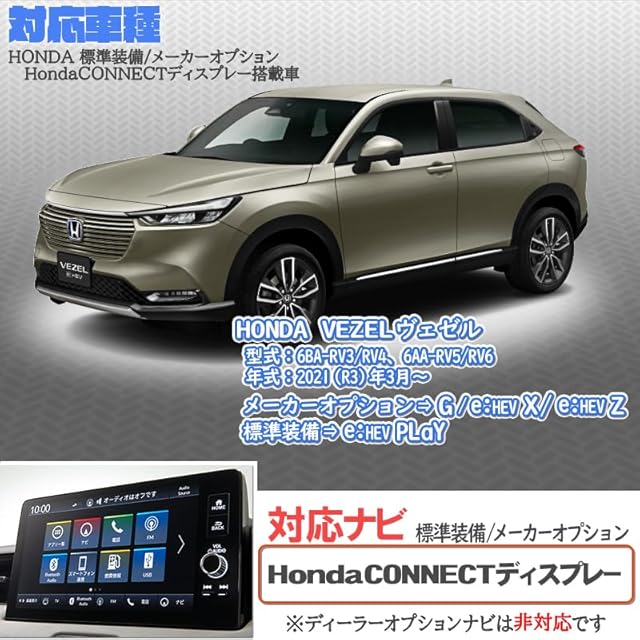 HONDA 新型VEZEL 標準HondaCONNECTディスプレー搭載車 年式:R3年3月~ 型式:6BA-RV3/RV4、6AA-RV5/RV6 ※2024(令和6)年4月のマイナーチェンジ以降のお車で動作確認ができたとのご報告がございました。