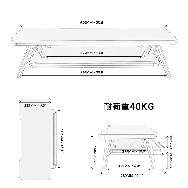 【ニーズに応じて天板の向きを変換】:幅60cmの卓上モニター台は様々なサイズにモニターが置いても適用です。さらに、ニーズと習慣により、自由に組み立て できます。カーブは後向きに組み立てられ、コードスリットとして使用することができます。カーブが前向きに組み立てられると、机上台の幾何学的な美しさが現れます。
