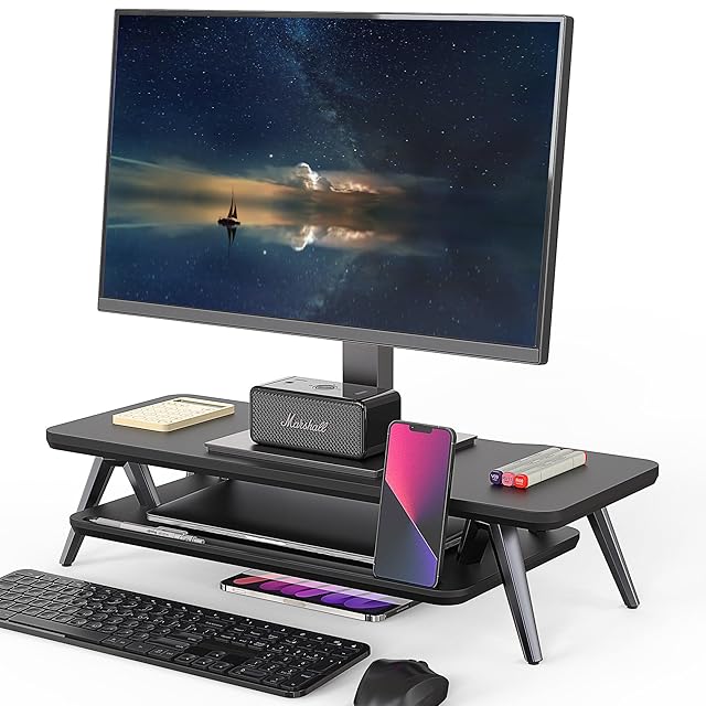 Fenge モニター台 卓上 机上台 パソコン台 机上ラック 60cm横幅 2段 木製天板 アルミニウム製脚 デスクトップ用 モニタースタンド pc台モニター台 パソコンラック 卓上 収納 整理整頓ブラックG04A2062B