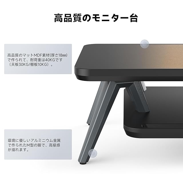 【安心安全な材質 ・優れた安定性】:環境に優しいMDFから作られたパソコン台は耐久性に優れ、M型のアルミニウム脚は高級が溢れながら、天板をしっかりと支えています。机上台の最大の耐荷重はなんと50kgで27インチのモニターを2台を置いても安定しています。