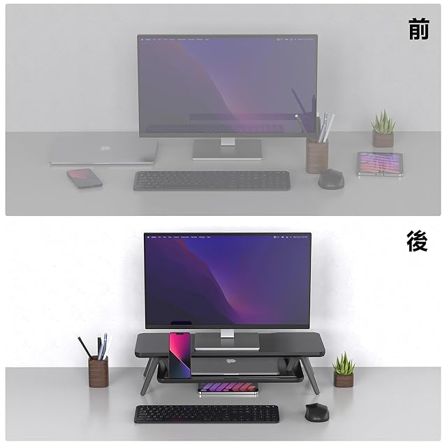 【収納プラス・デスク上をすっきり】:モニター台2段式で上段はスマホやタブレットやノートなどをすっきりに収納できます。 下段の空間を活用して、キーボード、マウスなどの周辺機器を整理し、デスクを広くご利用いただけます。