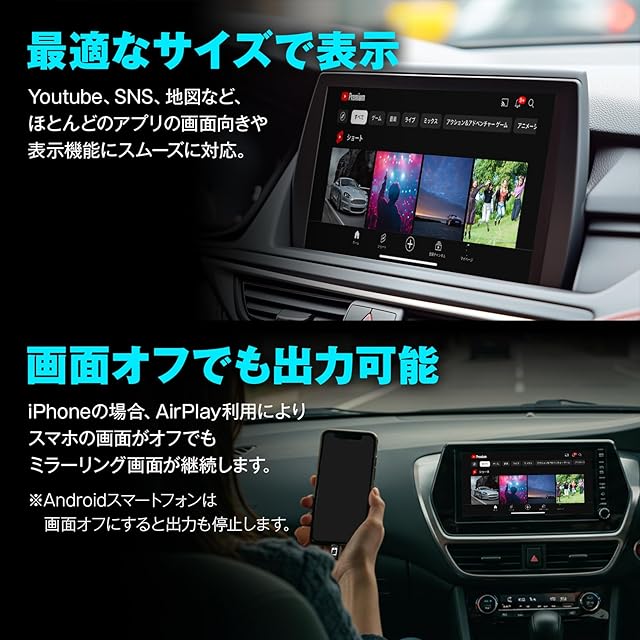 【最適なサイズで表示】 Youtube、SNS、地図など、ほとんどのアプリの画面向きや表示機能にスムーズに対応。 画面オフでも出力可能。 iPhoneの場台、AirPlay利用によりスマホの画面がオフでもミラーリング画面が継続します。 ※Androidスマートフォンは画面オフにすると出力も停止します。