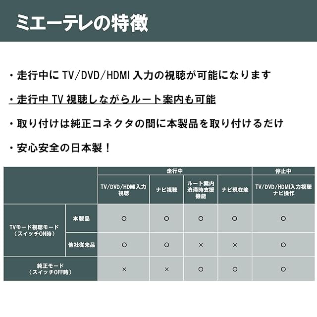 【注意事項】①本製品は付属スイッチの切替により映像の視聴が可能になります②本製品を取り付けた状態でも車検に適合します③ナビゲーションの通常機能(バックカメラやETC等)に影響はございません④テレビ受信、DVDの再生機能がない車両では機能しません。事前にご確認ください⑤取り付け等のサポートは対応しておりません⑥初期不良等の不具合は、購入後30日以内にご連絡ください、交換・返品にて対応いたします。30日以降は1年ですので、修理・交換対応にて対応いたします。交換・返品に伴う製品の取り付け・取り外し等の費用については弊社で負担いたしかねます