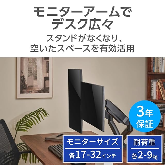 【簡単、自在に調節できる!】デュアルモニター環境を構築できる2アームモデル。17-32インチ対応、耐荷重2-9kg。モニターアームでデスク広々、スタンドがなくなり空いたスペースを有効活用できます。