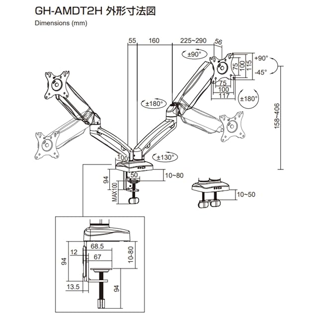 グリーンハウス デュアルモニターアーム 17-32インチ対応 耐荷重2-9kg 3年 メカニカル 4軸 GH-AMDT2H-BK