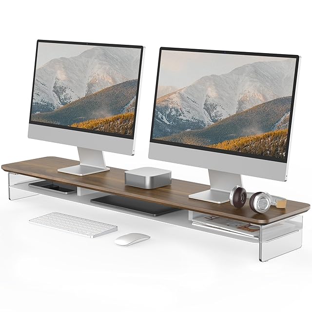 Fenge モニター台 モニタースタンド 卓上 机上台 パソコン台 PC台 机上ラック 108cm横幅 2段 木製天板 アクリル製脚 デスクトップ用 机上 モニタースタンド 机上台 pcモニター台 パソコンラック 卓上 収納 整理整頓 (ブラウン, 幅108cm)