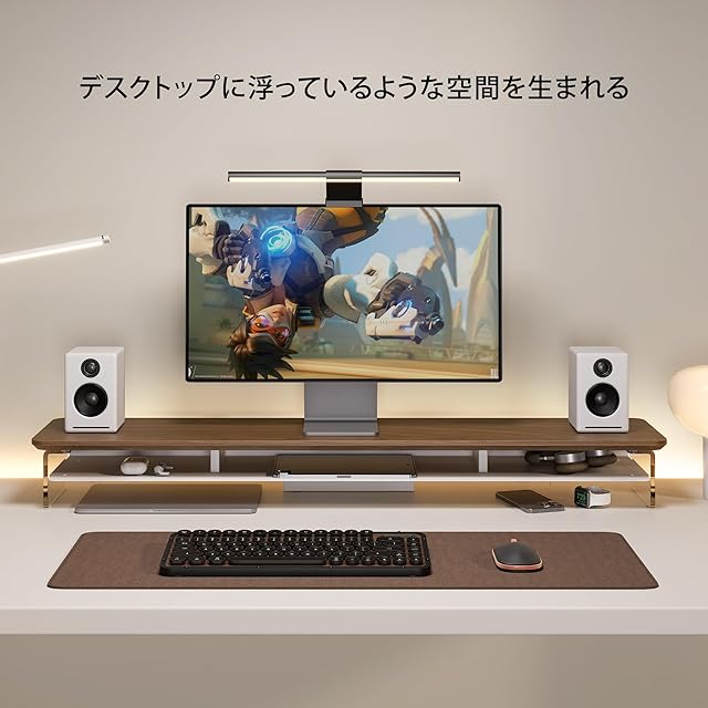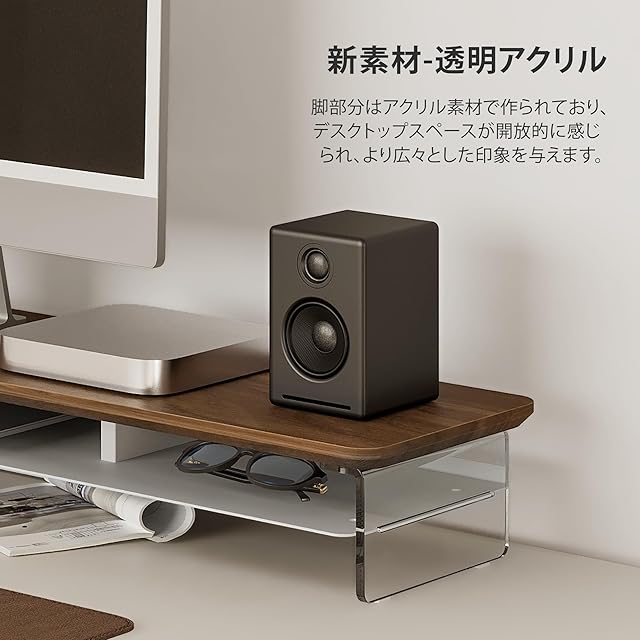 【アクリルの脚・浮いている空間】モニタースタンドの脚は、透明なアクリル板を採用しており、解放感があります。さらに、デスクトップに浮いているような感覚を与えます。特に夜にはLEDライトと組み合わせると、爽やかな昼間とは一変、神秘的な雰囲気を作り出します。