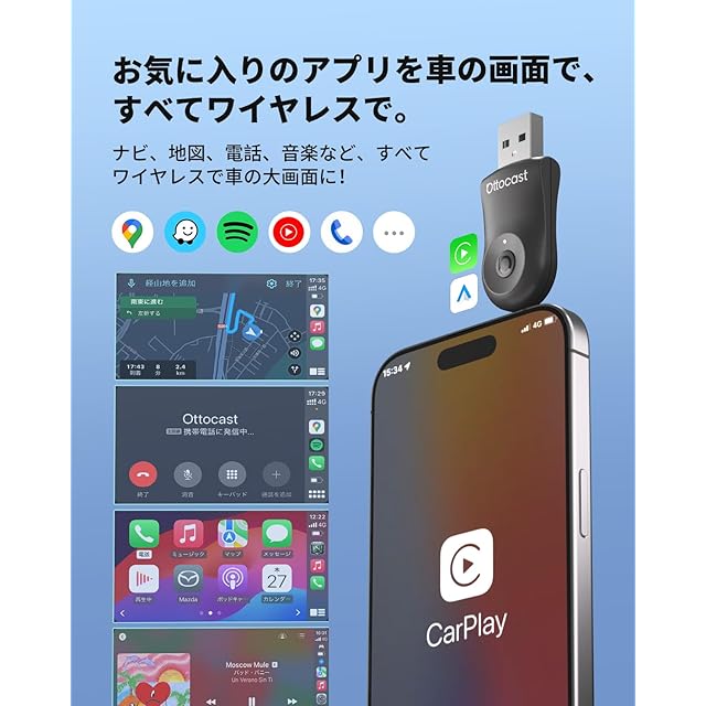 商品名:【公式】OTTOCAST オットキャスト Mini 2025最新 ワイヤレスCarPlay/Android Autoアダプター ミニ 純正有線CarPlay/Android Auto対応車専用 Bluetooth音楽/通話対応 プラグ&プレイ 自動接続 98%以上の車種適合 技適認証取得済