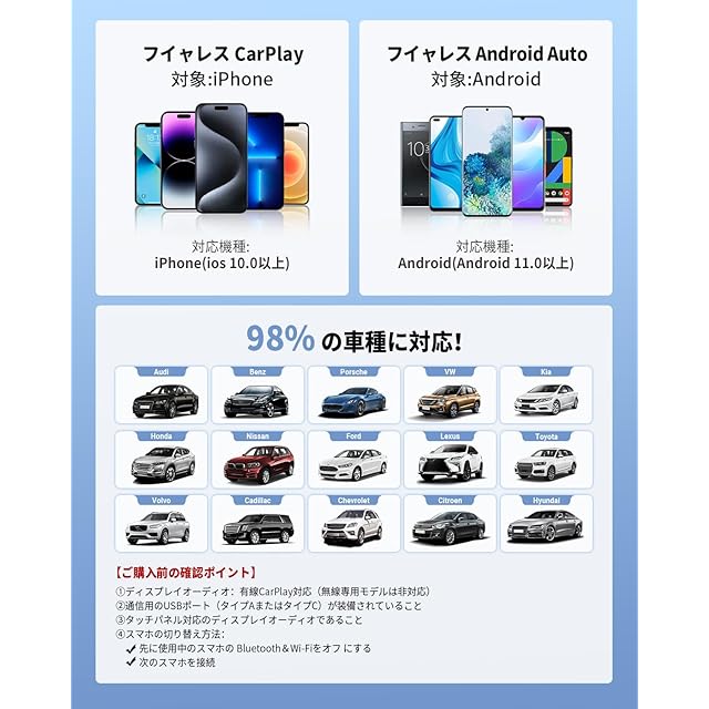 【ご購入前に必ずご確認ください】①対応車両:2016年以降の純正有線CarPlay(iPhone:iOS10以上)または有線Android Auto(Androidスマホ:Android11以上)搭載車両。②注意事項:本製品ではYouTubeやNetflixなどの動画視聴はできません。Wi-FiとBluetoothは同時にオンにし、他のデバイスと接続していない状態でご使用ください。