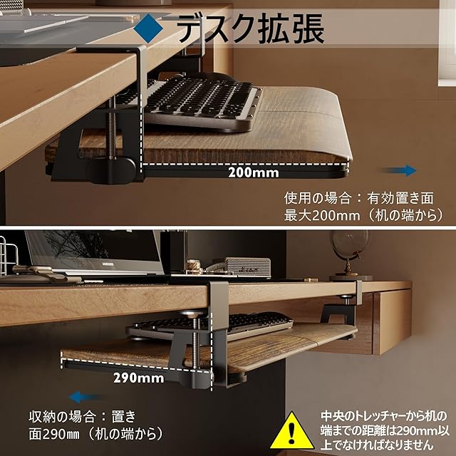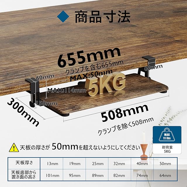 【広々とした作業スペース】ご注意: 左クランプから右クランプまでの全幅は760mmですので、購入前に製品の寸法と机の適合性を確認してください!!!幅650mm (クランプを含めて 760mm) × 奥行300mmx×高さ134mmのキーボードトレイはキーボードとマウスを一緒に収納できる広々とした作業スペースを提供します。最大耐荷重5kgで、安定性と耐久性に優れています。