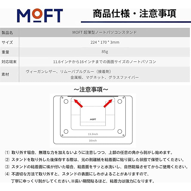 【取り外し簡単】 本品は繰り返し接着可能なリムーバブルグルーを採用するため、場合による貼りながら調整することや、剥がしてまた貼ることも、思いのままにできます!ご注意:取り外す場合、無理な力を加えないよう、上部の任意の角から剥がし始めてください。また、スタンドの粘着面に埃がついた場合は粘着面を水洗いし、自然乾燥させてからご使用ください。※注意点:Apple製のMacBook AirやMacBook Proはもちろん、DELLやMicrosoft、その他様々なノートPCに適合しますが、貼り付け面が凸凹している機種には使用することができませんので、ご注意ください。