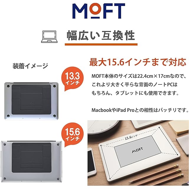 【驚きの薄さ、忘れる存在】 重さ僅か89g、厚さも3mmとなっています。マグネット内蔵設計で、スタンドを収納する時はパソコンの下に隠れることができ、存在感が極めて薄くなります。一方で、立てるときは速くてスマートになり、一度使うと忘れ難いパソコンスタンドです。最大15.6インチまでに対応、底穴付きの放熱対策も採用しています。Macbook Pro/Air/タブレットはもちろん、他の平底ノートPCにも対応するので、MOFTスタンドを是非一度試してください!