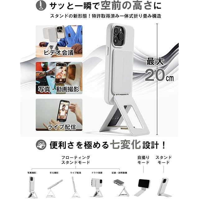 【特許取得設計!一体式折り畳み構造】 折り畳み時の厚さわずか0.74cmのカードサイズから展開して、頑丈なスマホスタンドに早変わりします。底部の三角形構造で安定性を高めました。