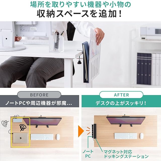 デスク横に後付けができ、ノートパソコンやタブレット、書類やノートなどを気軽に収納できます。