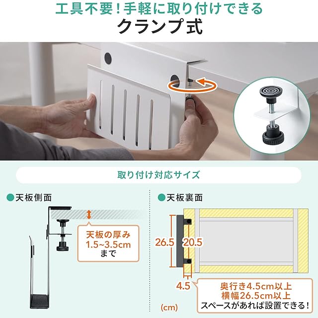 工具不要で簡単に取り付けができるクランプ構造。デスクに穴開けなどの加工の必要はございません。クランプは厚さ3.5cmまで対応します。