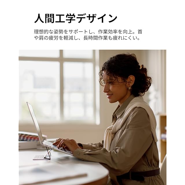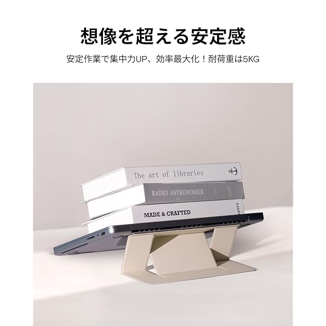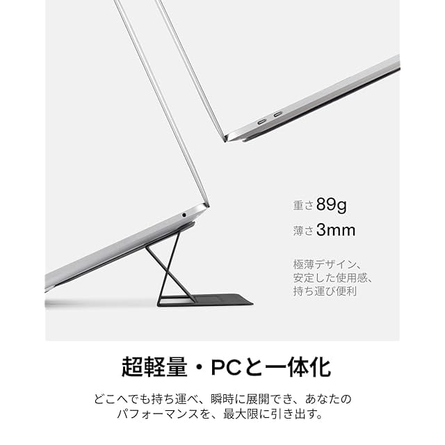 【厳選素材・重さに耐久】特製したポレウリタンとファイバーグラス素材と巧みな折り畳みデザインと組み合わせ、超軽量・超薄型で高強度・高安定性を実現します。耐荷重は最大5kg、作業時の安定・安全な支えを提供いたします。*ご注意:パソコンスタンドをご使用の際、キーボードの周りを叩くとパソコンが揺れるという意見を頂きました。この件について、実際に使用した場合を検討し、作業時両手を自然にキーボード上に置くと揺れることはないのでご安心ください。
