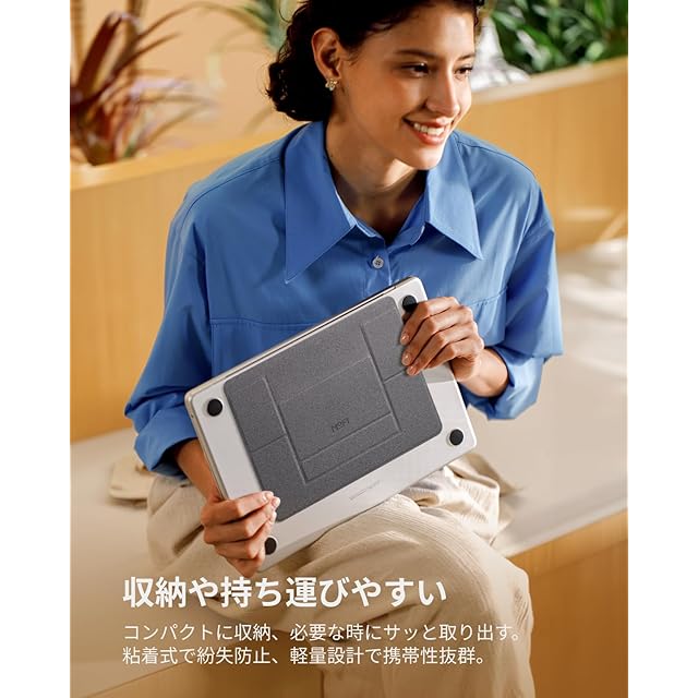 【極めた軽さ・幅広いに対応】重さ僅か89g、厚さも3mmとなっています。マグネット内蔵設計で、スタンドを収納する時はパソコンの下に隠れることができ、存在感が極めて薄くなります。一方で、立てるときは速くてスマートになり、一度使うと忘れ難いパソコンスタンドです。最大15.6インチまでに対応、底穴付きの放熱対策も採用しています。Macbook Pro/Air/タブレットはもちろん、他の平底ノートPCにも対応するので、MOFTスタンドを是非一度試してください!