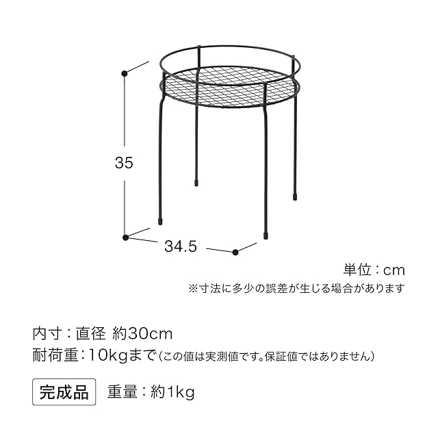 サイズ:約幅34.5cm×奥行34.5cm×高さ35cm。 重量:約1.0kg。 色:チャコールグレー。材質:スチール。内寸:約Φ30cm。耐荷重:10kgまで。
