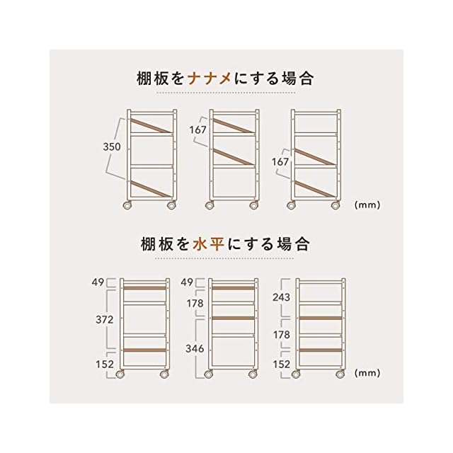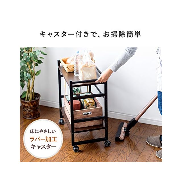 2枚の棚板を取り付ける場所は、3箇所から選択でき収納する物に合わせて調整できます。キャスターが付いているのでちょっとした移動にも便利です。